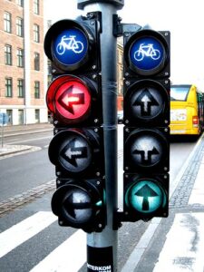 Traffic in Denmark is known for its safety and efficiency. Travel is better by bike or public transportation instead of cars, enabled by a well developed public transportation system that includes trains, buses, and metros. We noticed that drivers are calm and friendly. Many people use public transportation because it is not worth it for them to own a car, which also reduces the pollution caused by traffic. Trains run at speeds of up to 180 km/h, and it only took us 4 hours to travel from Copenhagen to Sonderborg, despite the considerable distance between the cities. Denmark has dedicated bike lanes and roads that have traffic lights specifically for cyclists. We also noticed that there are no paid parking lots.