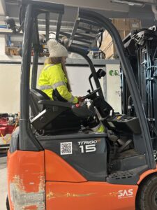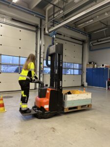 When we are changed, we go to the logistics department, where mentor Janne gives us work for that day. Often we went to the stimulators to perform tasks for the forklift, but now that we have completed all the tasks, we drive several types of forklifts. For the exercise, we had to move pallets from one side to the other side of the warehouse and i think we did a great job. Here, students and professors have many coffee breaks and, of course, lunch break during their work. The day passes quickly because we are very busy, and we leave at one o’clock. When we get home, we eat something and then rest a little.