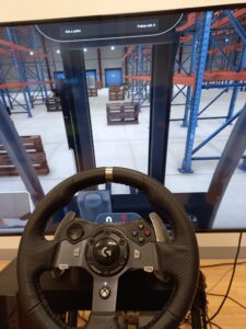 We are used to see behind our back. We tried a couple of times to look what is happening behind us and then we remembered that everything is on the screen. The forklifts are also sensitive about every move you make. The truck was much easier to drive and had so much more space on the screen. Hugo told us that the truck simulator cost about 20.000€.