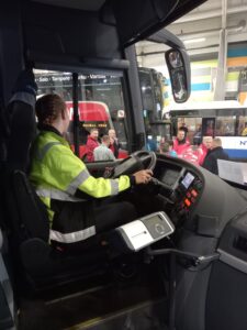 Today was ”bus Friday” as Toni would say. We started at 9 o’clock so got some sleep at the morning. When we came in the warehouse it was full of buses. Some of the Finnish transport companies had presentations for the students. The school was hosting them because most of the students want to become truck drivers and they wanted to present them buses and the drivers. The drivers also told many stories from work. All of the bus drivers were so kind. They explained everything to us again, because the first time was in Finnish. The first bus we sightsee was pretty well-appointed. It has 2 cameras, a toilet, free wi-fi and USB outlets. We were surprised at how comfortable and cozy the bus was and of course I had to try all of the buttons on the dashboard.