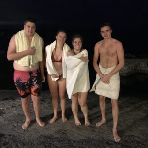 In the bigger one is hotter than in the small one. We decided to go to the bigger one. It was around 120°C. We stayed in there for about 15minutes and went out to cool down in the lake which had around 8°C . We repeated that 3 times. Every time we went it was better. It’s an interesting feeling when you are heated and you jump in to the lake where you feel all of your bones (haha) and when you come back to the sauna and you are sweating but feeling cold. We