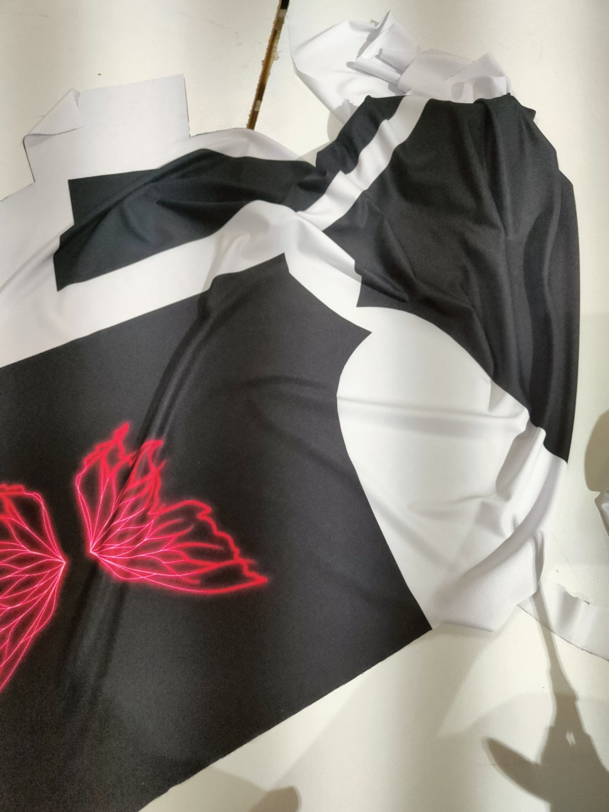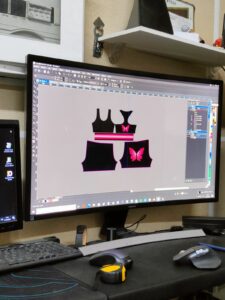 Ko se je končno sprintalo do konca in natisnilo na material sva potrebovali izrezati krojne dele do črte natančno. Nato sva za sprednji del potrebovali še podlogo. Sešili sva najprej podlogo na sprednji del zgornjega dela, kasneje pa še sprednji del skupaj z zadnjim. Hlače so imele isti postopek šivanja kot zgornji del vendar brez podloge.