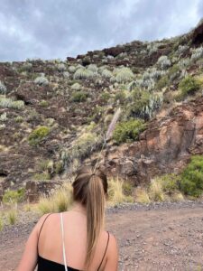 Ko sva se iskale v tem labirintu in srečno prišle na glavno cesto, ki naju pelje do hriba se nama je odahnilo. Manj kod polovico poti od tu naprej je blo betonirano ostalo pa kamnito in poraščeno z grmički. Tudi prvič sva videli kaktuse in alojovero tako blizu in ogromno. Visoki grmički pa so meni predstavlali iziv saj je ves čas nekaj šumelo iz njih ter polno mrtinčkov me je pripeljalo do tega, da sem pol poti tekla in skakala haha.