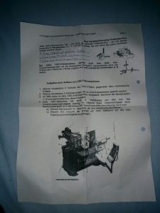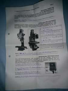 For the second day we had to be there earlier than yesterday, so we got there at 7.40 and as the day before Tom took us to the classroom where we got greeted by all of our new schoolmates. For the first two hours we had a professor lecture us about the basics of CNC machines which we already had in our first year. He also gave us a piece of paper and on it were things about CNC machines and some blank spots which we had to fill in with things that were being shown on the projector… It was all in German.