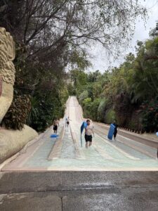 After that, we, girls, decided to try a slide that Nik warned us, was a “disaster”. We wanted to prove ourselves and just went up the stairs without reading the description. Živa and I shared a raft together and Maja took another with a British girl. All of the sudden, we were sliding like formulas down the slide and it was totally insane. Everything happened so fast, there was no time to think about what we were seeing or screaming for. One unforgettable part was when we went uphill. A powerful stream pushed us up. It was a little bit painful,  but when you don’t know what is happening, it really doesn’t matter.