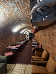 Not gonna lie, it felt a little creepy at first, but in a good way. The corridors were narrow, with brick walls and pipes all over the ceiling, so it felt more like we stepped into the past than into a museum. One thing that really stayed in my mind was a line of old helmets on the wall. Next to them there were just simple chairs and boxes, nothing fancy at all. But somehow that made it more real, because you could actually imagine people sitting there and waiting. In another room there were small tables and chairs, almost like a little resting area, which felt kind of strange for a bunker.