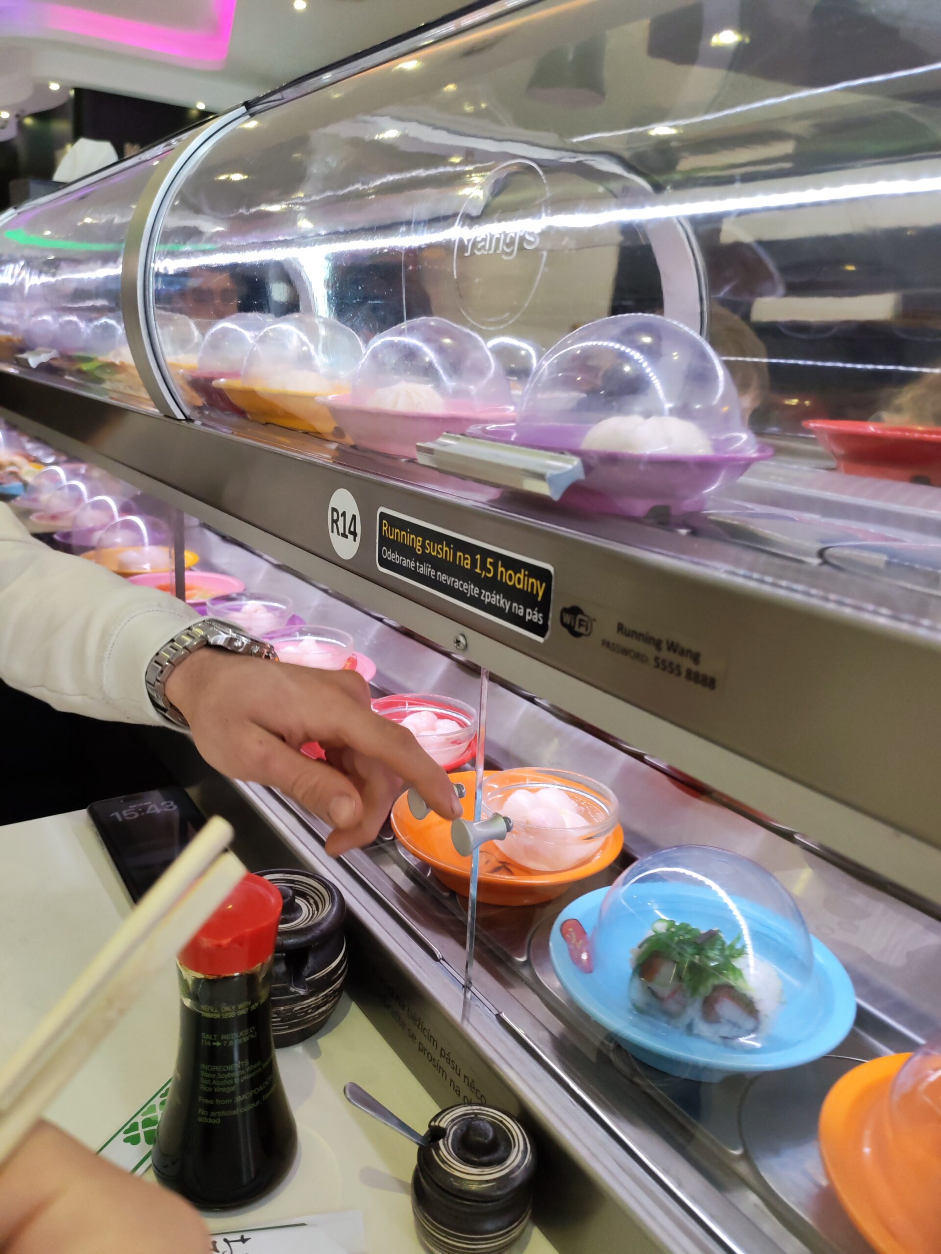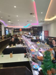 Proti koncu smo začeli več jesti zunaj, ampak ne veliko več, samo parkrat smo šli iskati kakšno pico ali pa poskusili kakšno domačo jed, kot na primer Svíčková na smetaně, to je najbolj znana češka jed. Gre za mehko govejo pečenko s kremasto omako iz korenja. Šli smo tudi jest v ‘free running sushi’, kjer smo se v 90 minutah najedli kot svinje. Jaz osebno sem se tako najedel, da me je glava bolela.