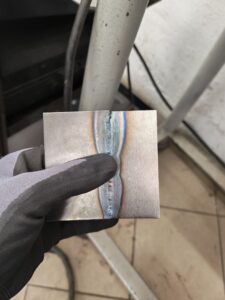 Next, I was really interested in TIG welding, which took a while to explain, but after they explained how it works, I didn’t take long to get the hang of it. The picture you see was my third try, and the teachers also said I learned it very fast and that they were impressed. But that was only TIG welding without adding the wire. Adding the wire is harder and a much more complicated process, which I also learned took me more tries to get it, but after I started to understand how the welds behave, it didn’t take me long to learn a “butterfly walking” which is a style of TIG welding that is commonly used.