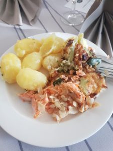 Pri veliko jedeh Finci dodajo zraven še kečap. Tradicionalne jedi so pita z ribjim ali svinjskim mesom, ribja juha, ragu severnega jelena in polnjen losos zelišči in sirom. Opazil sem tudi, da nimajo enakih jajc kot pri nas, temveč so bela. Finci spijejo zelo veliko kave, ki pa ni enaka kot pri nas. Zdi se mi preveč tekoča in me spominja na čaj. Spijejo tudi zelo veliko piva in vodke.