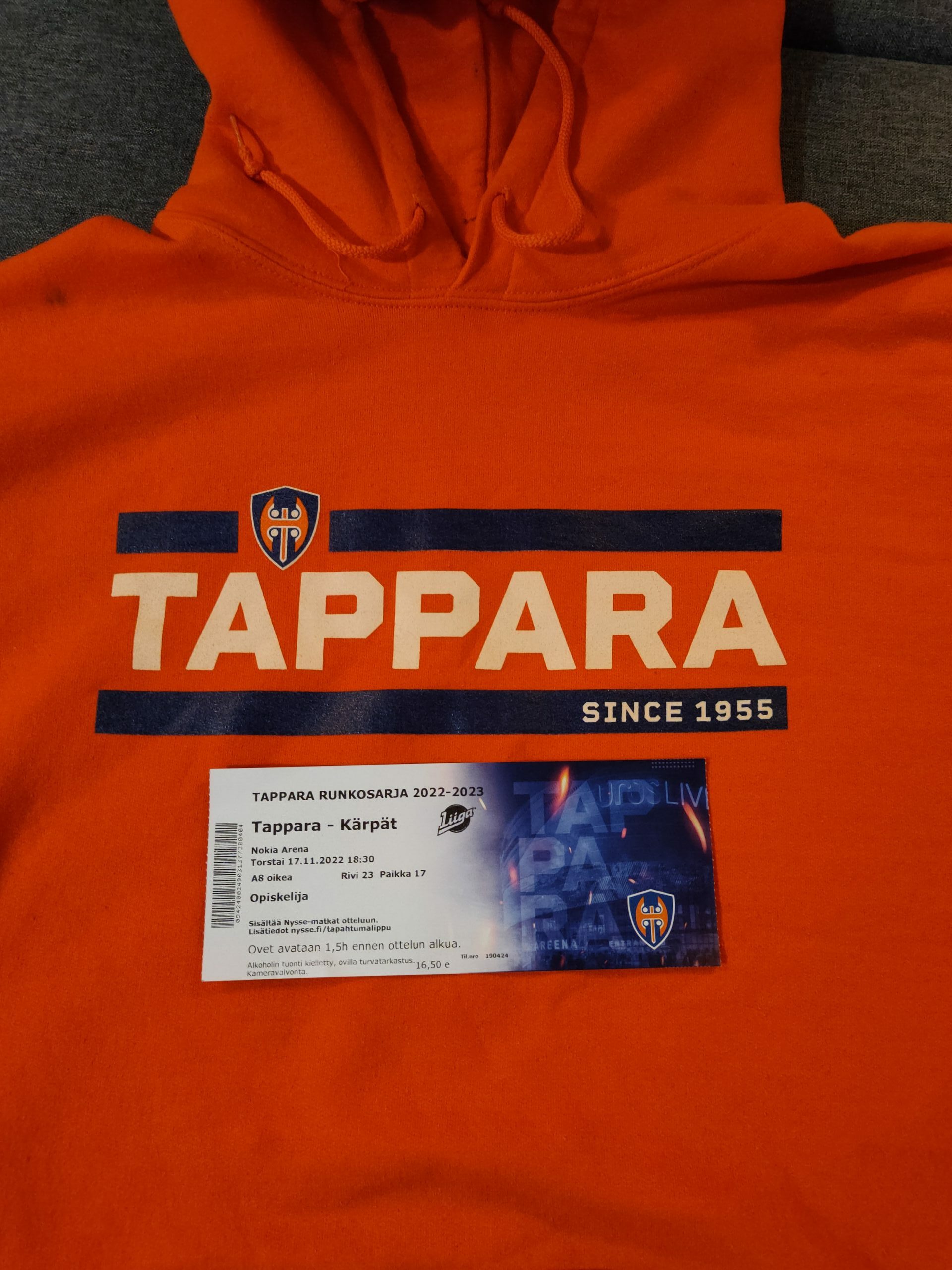 In Finland hockey is a very popular sport, and everyone is talking about it, so we decided that we wanted to go see one of the matches. But there was one more thing. Our school actually decided that they were going to buy us a ticket for the hockey match. We also went to the fan shop and bought hoodies with a Tappara logo on them.