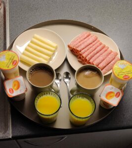 Dan se je zame začel, lahko rečemo, na zanimiv način. Zbudil sem se in se odločil, da bom Ani in Aneji pripravil že dolgo obljubljen zajtrk v postelji. Skuhal sem kavo in pripravil hrano, ter se psihično pripravil, da jima vse skupaj nesem v sobo, saj sem vedel, da ne bosta ravno zadovoljni, če ju bom zbudil. K sreči sem jih še dobro obnesel, postavil sem jima pladenj na stol zraven postelje, ju zbudil in kar na hitro zapustil sobo za lastno varnost. Nato je Aneja čez dobre pol ure prišla ven iz sobe in obrazložila, zakaj me je skoraj ubila. Zatem sem še sam pojedel nekaj malega in se odpravil ven na krajši sprehod, kjer sem srečal srno in 2 veverici. Ko sem prišel domov, so me pa vsi trije počakali pred vhodom, saj smo se že odpravili na nov sprehod.
