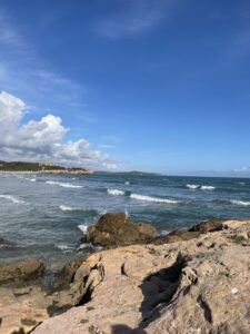 Ko sva prispela na plažo, sva si na skalah našla lepo mesto, kjer sva odložila svoje stvari.