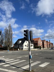 Semaforji na danski so drugačni kot v Sloveniji so precej tanši, na prvi izgled so mi bili zelo smešni. Velika večina pločnikov je tlakovana z tlakovci oz majhnimi betonskimi ploščami. Prvi tedn ko smo bili na Danskem sm bili vsi navajeni če ni nobenega avtomobila gremo čez cesto nato pa je profesor rekel to ni balkan in, da je tu drugače. Zato smo sedaj vedno čakamo čeprav gremo ševedno ponavadi čez cesto. Ampak se trudimo, da ne. Avtomobili so podobni kot v Sloveniji razn tega, da jih je veliko predelanih, da so glasnejši ali pa spuščeni. Mogoče vidiš več bolših avtov kot v Sloveniji ampak to zato ker imajo Danci veliko večji plačo kot v Sloveniji. Se pa kar hitro izgubišker vse hiše izgledajo podobno in in včasih, kar zamešaš kje si.