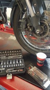 Dan na delu se je seveda začel z jutranjo kavo. Nato mi je mentor naročil, da moram zamenjati sprednje, ter zadnje zavorne ploščice. Stvar je zelo podobna kot pri avtomobilu.