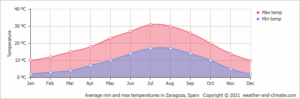 Temperature so poleti vroče in dosežejo do 44,5 °C. Kar sem jaz takoj opazil ko smo prispeli v Zaragozo je to, da skozi piha močan veter. Domačini so nam rekli, da je to za njih povsem normalno, saj v dneh ko ne piha veter, se na nebu pojavijo oblaki in nastane mrzlo in megleno vreme.