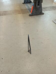 Začeli smo z izdelavo nekih nogic za mizo. Najbolj za malo se mi je zdelo ker smo dobili sliko nogice na listu papirja, zraven pa je s kemičnim kulijem pisala samo višina. To v tem primeru ni bilo dovolj, saj je bila noga na trikotni ploščati železni ploščici iz dveh polnih železnih palic premera 10 milimetrov. Ena palica je bila dvotočkovno privarjena na ploščato železo saj je bila ukrivljena na drugi strani. Ta je bila postavljena pod kotom, druga palica je bila pa pravokotno na ploščato trikotno železno ploščico. Jaz sem se k delu pripravil tako da so bile palice postavljene ravno obratno, tako da sem predvidel ukrivljeno palico pravokotno, ravno palico pa pod kotom, na ploščato železno ploščico. Tako sem razbral iz slike na papirju in tako se mi je zdelo bolj smiselno. Ko sem imel že vse pripravljeno za varjenje sem izvedel da je ravno obratno in sem bil jezen ker sem imel malo več dela kot pa bi ga lahko imel. Ampak vseeno končni izdelek je bil uspešno izdelan in lep.