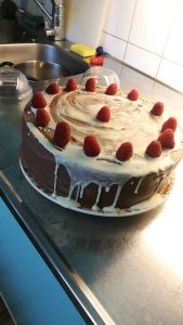On Wednesday we started one of our last days in school. We told that we won’t come to school on Friday, because we had to clean our apartment. On Wednesday Tamara and me started new projects. I wanted to make a matching skirt and top, but i ran out of time to finish. Tamara also didn’t quite finish but she was making a cardigan for her adorable nephew. I bought the fabric i used a little time ago. I taught it was beautifull so i bought it. I first draw a pattern directly to the fabric, than i cut it. After that i started sewing. The skirt is almost full circle. The top is very simple but i didn’t sew it together, i only cut it out. When we got home we baked another cake, because our Vanessa was celebrating, it was her 19th birthday.