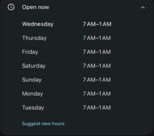 Glede delovnika so proizvodnje podobne našim, saj delajo od 7:00 do 15:00. Večina trgovin pa ima urnik “9–5”, kar pomeni od 9:00 do 17:00. Kar me je zelo presenetilo, pa je dejstvo, da ni le veliko trgovin odprtih v nedeljo, ampak so nekatere med tednom odprte celo do 1:00 zjutraj, ob nedeljah pa do polnoči. Tega v Sloveniji ne vidiš in se hitro razvadiš, ko greš lahko v trgovino ob 23:00 ali v nedeljo popoldne.