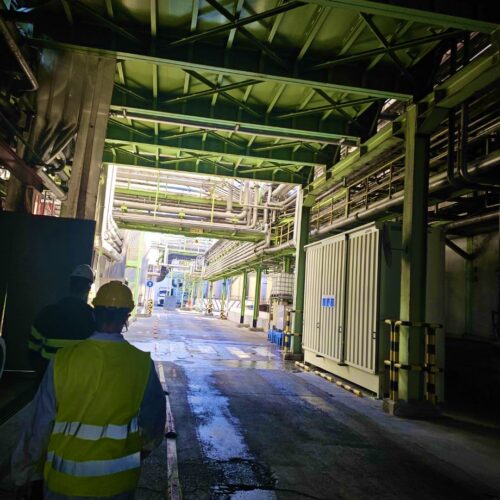 Varnostni protokoli so v takšnem obratu izjemno strogi. Vsi zaposleni moramo nositi čelade in celotno delovno obleko praktično povsod, razen v sobi za malico. Posebej zanimivo je, da mora imeti vsak delavec pri sebi posebno tekočino za izpiranje oči. Ta je nujna v primeru, če bi kakšna kemikalija prišla v stik z očmi, saj lahko takoj nevtralizira učinke. Seveda smo tudi mi dobili vso potrebno zaščitno opremo, preden smo stopili v obrat.