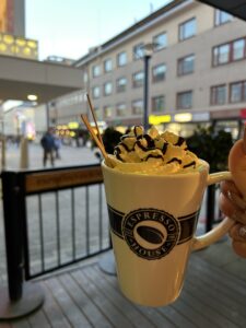 Kmalu za tem pa se je pouk končal zato sva se odpravili nazaj v dijaški dom in se pripravili za odhod v mesto. V mesto sva šli z avtobusom saj je bilo zunaj še bolj mrzlo kot ponavadi. V mestu sva najprej spili toplo kavo nato pa se sprehodili po mestu, kjer se je že lahko čutilo božično vzdušje. Proti koncu večera smo pa z najinim sosedom Rokom in njegovo prijateljico Siri odšli na še eno pijačo. Siri je domačinka in povedala nama je dosti novih mest kjer lahko spoznava ljudi in preživljava najin prosti čas. Vesela sem, da imam možnost spoznati toliko novih ljudi in z njimi preživeti prosti čas na Finskem.