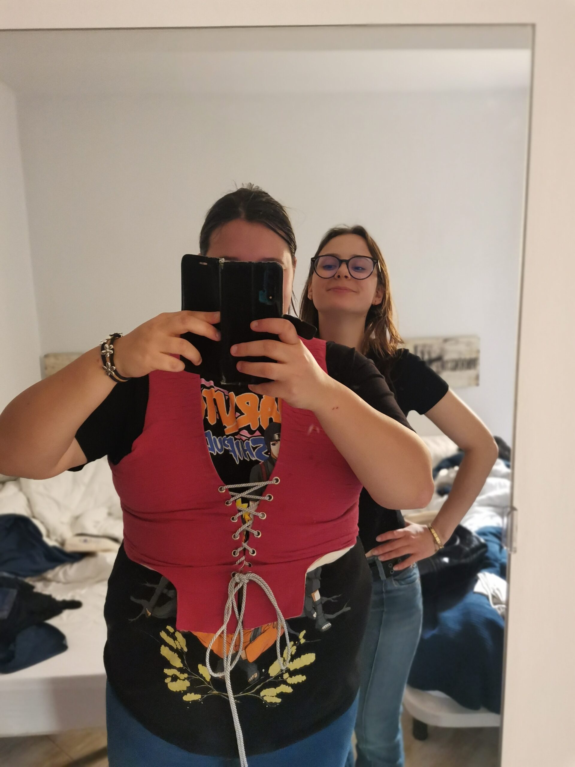 Thankfully i didn’t have to do the holes on the old, scary tools, Doroteja did it! Once the holes were made we cut some try on string and off we went to go home! At the apartment I had to try it on, ziva wouldn’t let me leave the room without doing it. So I put on the corset and she helped me tie it. It was funny how it was a bit harder to breathe, she said I looked awesome in a corset and that I should wear it to school. Haha, no. I won’t.