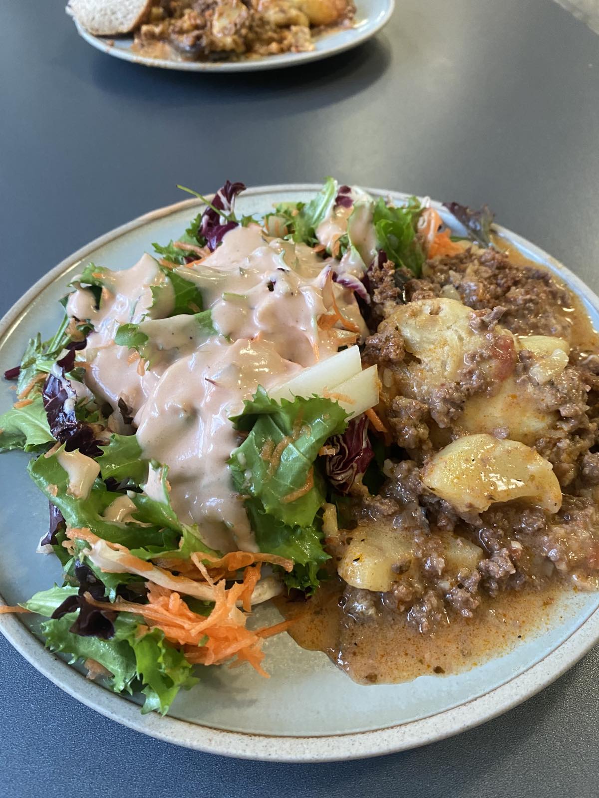 We have lunch at 11:50 at school. A typical meal includes protein (meat, fish, poultry or legumes), carbohydrates (rice, potatoes, pasta or bread) and lots of vegetables.