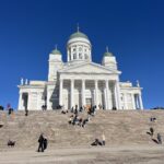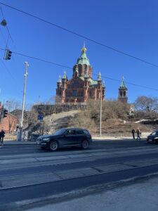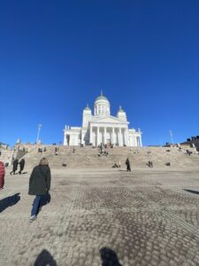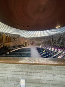 We also visited some sights. We went to the Temppeliaukio Church, which is built into the rock and looks really interesting. We also saw the Helsinki Cathedral, a big white church in the city center.