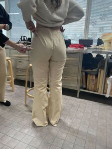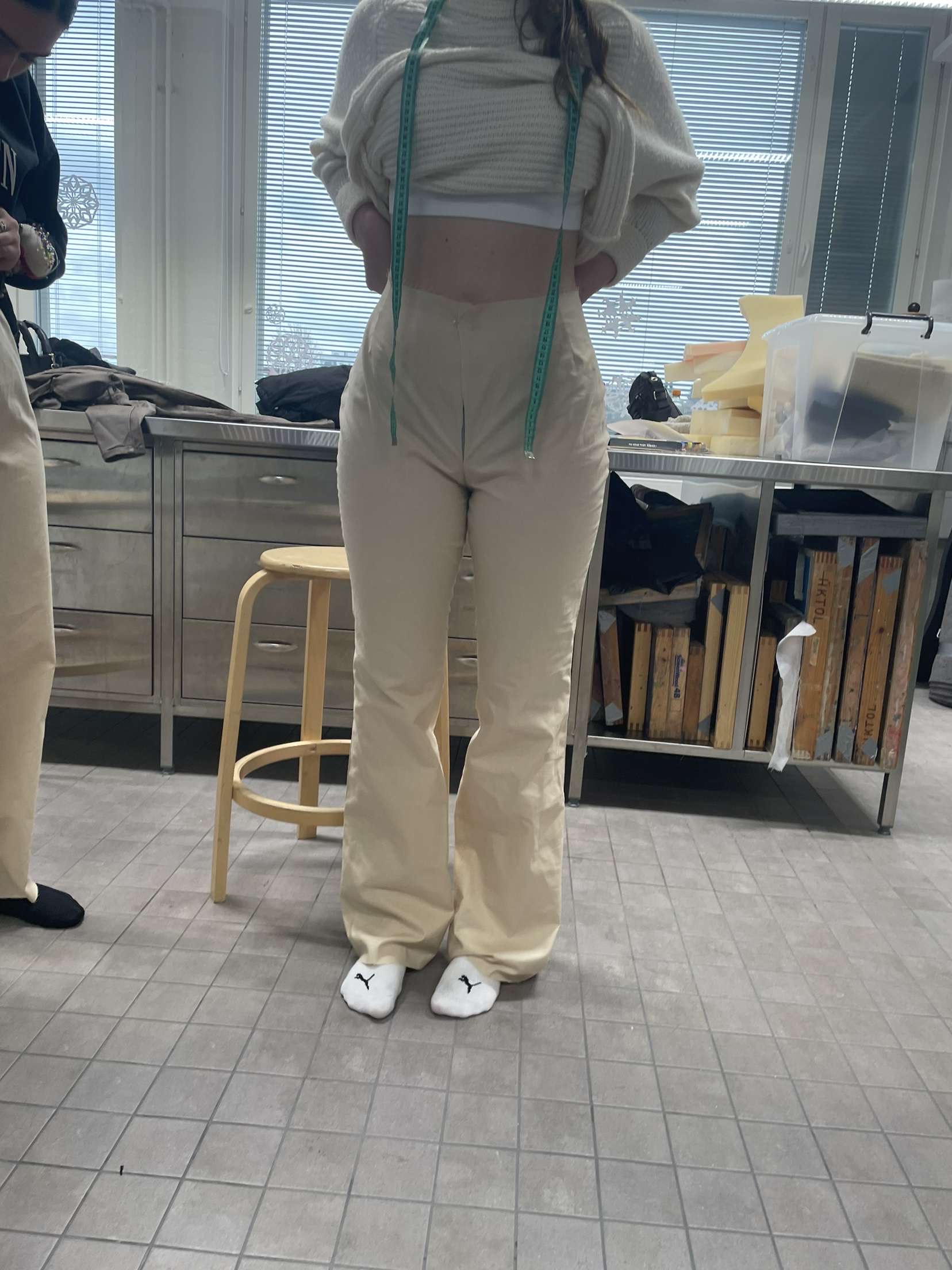 The week started with us making the pattern for classic pants. The Finnish way of pattern-making is more complicated and takes longer than the one at home. First, we sew an easier version of the pants with a light brown try-out material. When that was done we tried the pants on and our classmate pinned all the things we had to fix later on the real pattern for our pants. I wanted bootcut pants that I am making out of black cotton material. When I had everything pinned on the pants I changed the pattern like the pants and measured how wide I wanted the bottoms. Later I drew the pants as wide as I wanted and connected them to the knee line. I placed the pattern on the fabric and measured how much I need. I folded the fabric in half and put all the pattern pieces on. I added the seam allowance on every side. After I started cutting out all of the pieces. For the pocket, I had to use a different fabric that is lighter than the pants so it doesn’t show through. When all that is done I started sewing all the parts together.