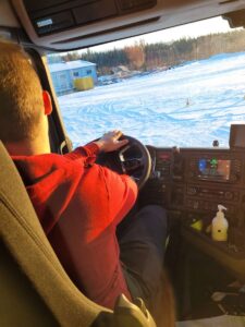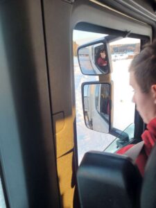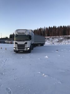 In končno je prišla današnja sreda. Zjutraj sva se z Izo odpravila proti šoli in nestrpno sem čakal v delavnici, kdaj se bo akcija začela. Voznik Williem je opravil rutinski dnevni pregled vozila pred začetkom vožnje, Simo nam je vsem pokazal nekaj ključnih točk in delov, na katere moramo biti pozorni ko začnemo z vožnjo, sploh v takšnih hladnih dneh. Že smo peljali čez dvorišče in vijugali mimo avtomobilov in se vključili na glavno cesto. Williem je vozil zbrano, mirno ter sproti poslušal nasvete Sima. Med potjo je opisoval kako je voziti takšno kompozicijo, nekaj časa nama v Angleščini nato v Finščini, včasih je tudi pomešal kdo razume kateri jezik in smo se vsi malo smejali. Kmalu smo prispeli na poligon, kjer se vozniki urijo v obračanju in parkiranju takšnih skupin vozil. Williem se je lotil parkiranja, mi pa smo ga opazovali od zunaj in Simo mi je podal še nekaj koristnih nasvetov za vožnjo. In končno moj trenutek, ki sem ga čakal po pravici povedano že nekaj let. Sedel sem za volan nove Scanie, ki sicer ni z V8 motorjem a sem bil vseeno zadovoljen, da bom vozil. Zapeljal sem nekaj krogov po dvorišču, da sem še sam občutil obnašanje vozila in najprej ravno vozil vzvratno. Šlo mi je odlično, zato je Simo predlagal, da se lotim parkiranja ob drugem vozilu. Spet sem zapeljal okoli in brez popravljanja parkiral. Sledil je še težji del, kjer mora voznik pod pravim kotom odpeljati ovinek in vzvratno parkirati v označeno polje, a to v obliki črke S. Zame je bilo to prvič, zato sem moral še enkrat popraviti svojo izhodiščno točko za parkiranje, nato pa sem brez velikih težav opravil nalogo. Simo me je pohvalil, saj malo popolnih začetnikov tako hitro osvoji vožnjo s takšno prikolico. Bil sem ponosen nase, a brez dveh dni v simulatorju nebi mogel opraviti te naloge. Vaje na računalniku so odlične, saj prihranijo veliko časa, denarja in skrbi ampak brez vaje v praksi pa tako ali tako ne more delovati nobena stvar.