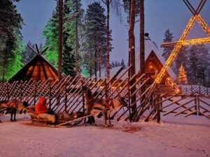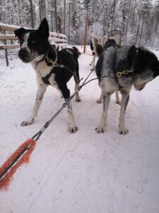 Z angencijo, ki ureja vodene oglede, predstavitve v božičkovi deželi in vse dejavnosti zraven, smo se odpravili najprej na ogled haskijev. To je vrsta psov, ki so podobni volkom. Najprej so nam predstavili, kako zaposleni skrbijo za njih in kako živijo skozi celo leto, nato pa smo si ogledali še mladiče haskijev ter se z vpreženimi haskiji na saneh peljali skozi gozd.