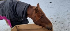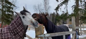 Takoj sva poprijela za delo očistila hlev, med tem pa konje spustila v menaž. Po opravljenem delu sem pomagal skrtačiti konja in ga pripraviti za ježo. Za pomoč pri opravljenem delu sem lahko jezdnil kobilo Heivain. Kobilo katero sem jezdil je leta 2020 zmagala na dirki in leta 2021 dosegla II. mesto na razstavi konj. Po končani ježi mi je razkazala še prostore in okolico, skladišče hrane za konje, prostor kjer tuširajo konje in shrambo. Tako kot povsod tudi na Finskem niso imuni na medsosedske spore. Zaupala mi je, da ne ve kam bo lahko preselila svojo kobilo, če bodo hlev zaprli, saj se sosed pritožuje nad hrupom in vonjavami iz hleva. Z ponudbo in storitvami najemodajalca, kjer prebiva kobila je zelo zadovoljna, kljub temu, da za oskrbo mesečno odšteje dobrih 400 evrov.