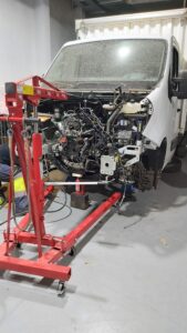 As I explained in another blog, I disassembly the front of Renault so when Marcos came to work, we took out the motor. I moved all the parts from the old to a new engine block, and Marcos set the timing belt, so that the pistons and valves were set correctly. We installed transmission to the motor, with which we had a little bit of trouble putting together. Then it was time to put it back in and it went quite easy.