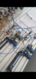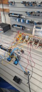 Proti koncu, ko smo zaključili z nalogami, ki so vključevale samo pnevmatiko, smo dodali še elektriko. S tem smo dosegli, da smo lahko elektronsko krmilili pnevmatsko vezje.
