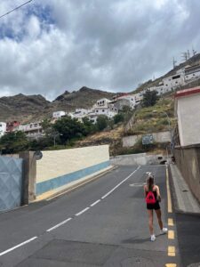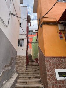 Najprej sva morali priti izven mesta, nekaj časa hoditi, na najini desni ob vodi – morju na levi pa so mimo naju vozili avti, motoristi, kolesarji…Tako sva hodili približno 30minut, ko je najina pot zavila do manjšega nasejla hišk, ki ležijo pod vrhom gore na katerega sva se odpravljali. Pot na navigaciji je kazala, da morava iti skozi to naselje. Bilo je sicer lepo na pogled, a pot med hiškami je bila malo strašna. Ulice niso bile jasne, skoraj da jih ni bilo, samo neke strme stopnice in tu pa tam kakšen domačin.
