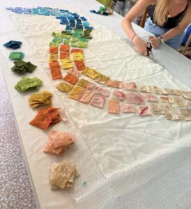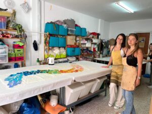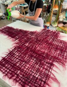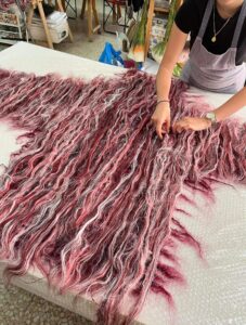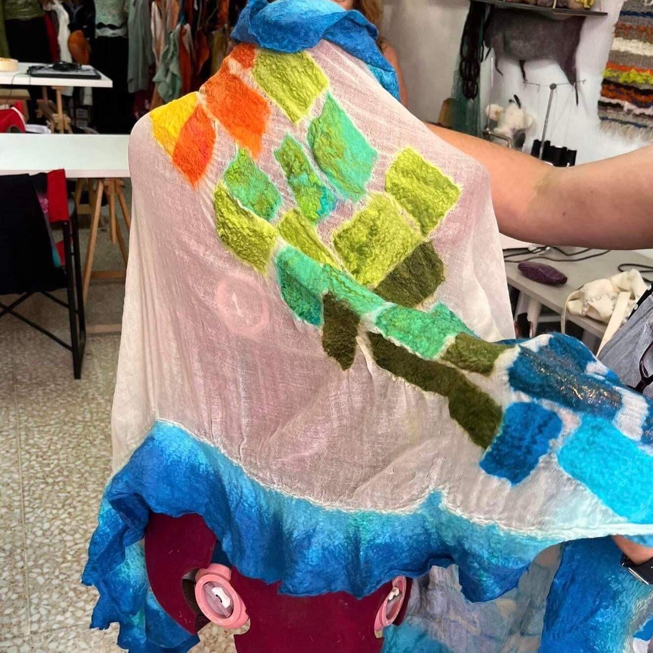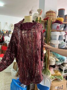 V delavnici dela seveda ona in še gospa Nuria, obe sta zelo prijetni in prijazni, vedno pokažeta kako je treba kaj:) Delo z volno ni enostavno, za izdelovanje tovrstnih izdelkov je potrebna natančnost in praviolna tehnika. Uporabljajo se različni materiali poleg volne, tudi viskoza, lan, svila, bambus…Izdelke spaja skupaj z milom ter vročo (skoraj vrelo) vodo. Potrebno je tudi dosti drgnjena in raznih krožnih gibov, da se vse dobro skupaj spoji. Spodaj ima vedno položeno plast plastičnega ovoja z mehurčki, ki se po navadi uporablja pri pošiljanju delikatnejših stvari po pošti. Ona pa med eno in kasneje med dvema plastima tega izdeluje razne obleke, majice, pulovrje, vaze, pokrivala in še druge stvari.