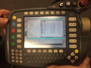 Ko sva končala z delom sva odšla do roboto namestila krmilnik za senzor ter priklopila vse na omarico kjer so ostali krmilniki. Nato sva začela z programiranjem. Tom mi je dovolil da naredim svoj program za robota. Program sva napisala tako, da sem vodil robota ter shranil pozicijo robota z PTP stavkom. Izgledalo je tako: