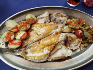 Riba je prišla že očiščena in pripravljena na zelo preprost način – pečena na olju. Čutila sem, da je bilo uporabljeno kakovostno olivno olje, ki je lepo poudarilo okus ribe. Priloga je bila kuhana zelenjava in enak krompir kot pri lignjih.